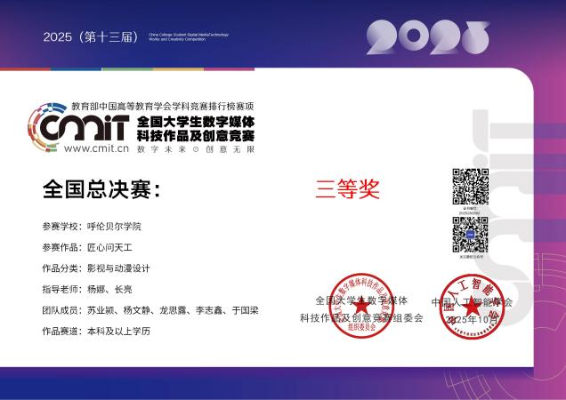 全国总决赛的激烈角逐中,苏业颖、白林城、龙思路、李志鑫、于国良等同学组建的团队表现亮眼,其创作的两部作品凭借鲜明的创意主题、扎实的技术呈现与深刻的行业洞察,从众多参赛作品中脱颖而出,双双获评全国三等奖。在内蒙古赛区评选中,我校学子同样捷报频传,成功斩获二等奖2项、三等奖3项,全方位彰显了新闻学专业学子在数字媒体创作领域的综合实力。