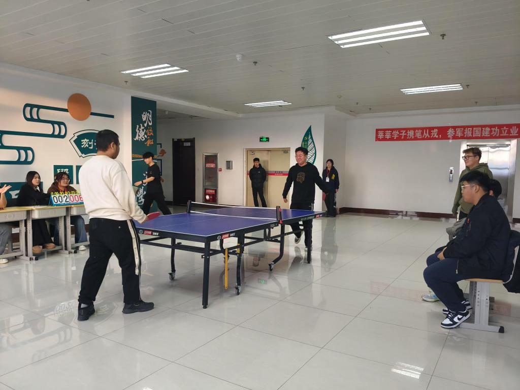 为增强大学生体质,文学院体育部于2024年12月1日在崇文楼B座5楼大厅举办了乒乓球比赛,本次赛事吸引了众多乒乓球爱好者参与,现场观众热情高涨。